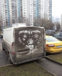 Sa spécialité donc : dessiner de véritables œuvres d’art à l’aide de la saleté de certains véhicules. Le résultat est juste bluffant ! Ses outils : ses doigts principalement, pour enlever la couche de pollution. Avec un tel talent, on peut se demander quand est-ce qu’il passera au niveau supérieur en alliant Urbex et Street Art… Qui sait peut être qu’un jour, il visitera le site de Tchernobyl